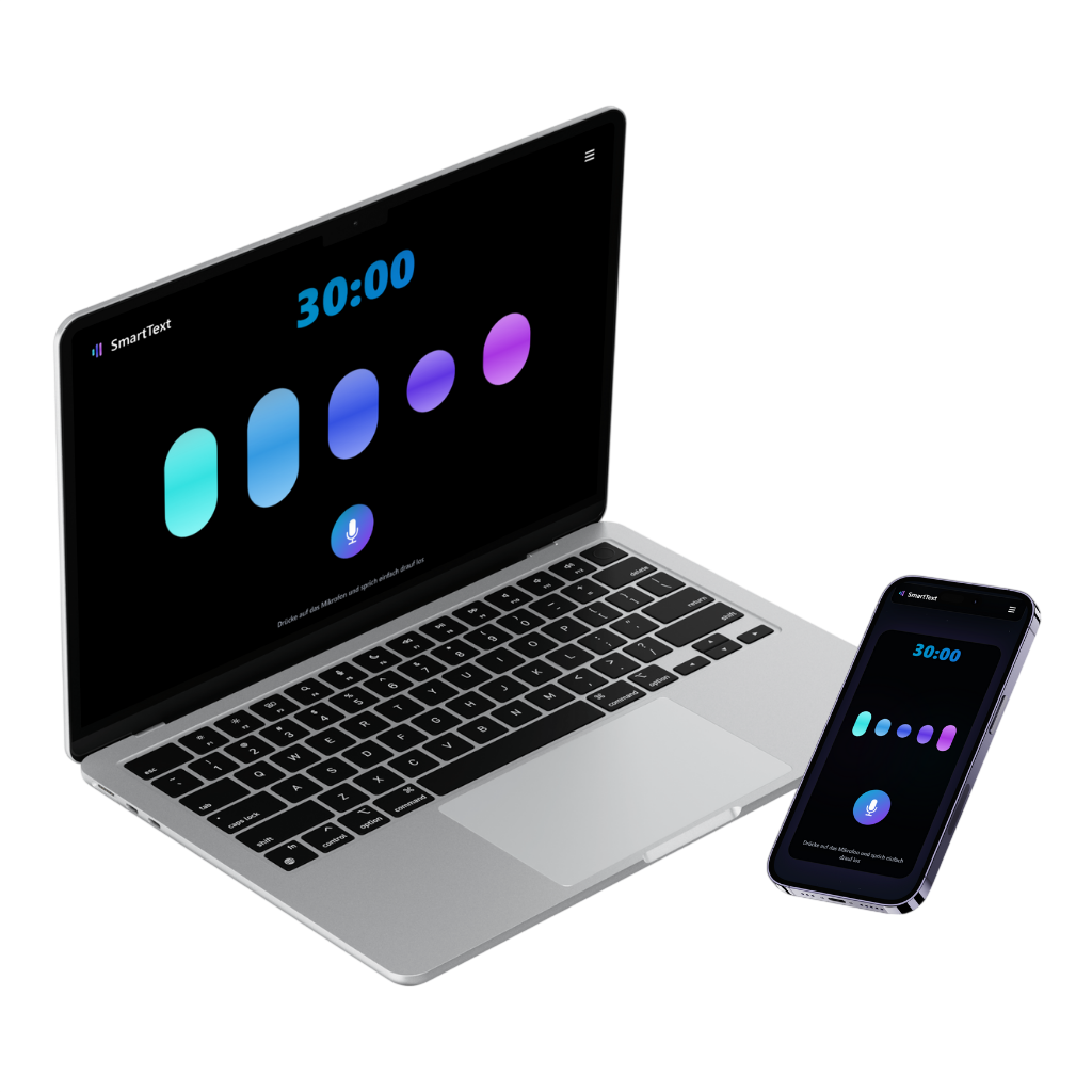 SmartText nutzt KI, um Deine Sprachaufnahmen in sekundenschnelle in fehlerfreie, strukturierte und stilistisch angepasste Texte zu verwandeln.